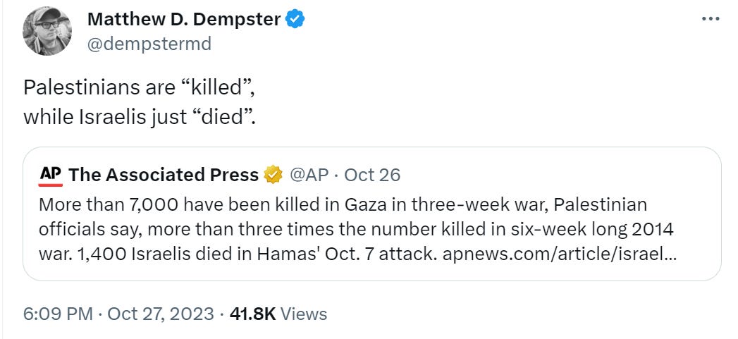 The AnointedSemantic DifferencesEmma VaisOct 28, 20232ShareAP artfully applies the active and passive voices when reporting on Palestinians killed by IDF, and Israelis killed by Hamas pogromists.Tweet here.Photo by Jas Min on Unsplash